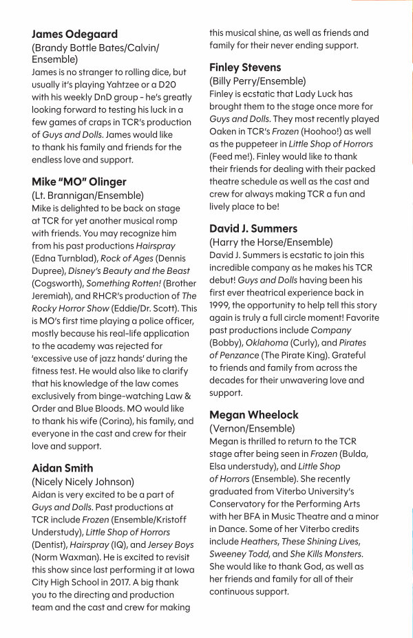 Aidan Smith( Nicely Nicely Johnson) Aidan is very excited to be a part of Guys and Dolls. Past productions at TCR include Frozen( Ensemble / Kristoff Understudy), Little Shop of Horrors( Dentist), Hairspray( IQ), and Jersey Boys( Norm Waxman). He is excited to revisit this show since last performing it at Iowa City High School in 2017. A big thank you to the directing and production team and the cast and crew for making