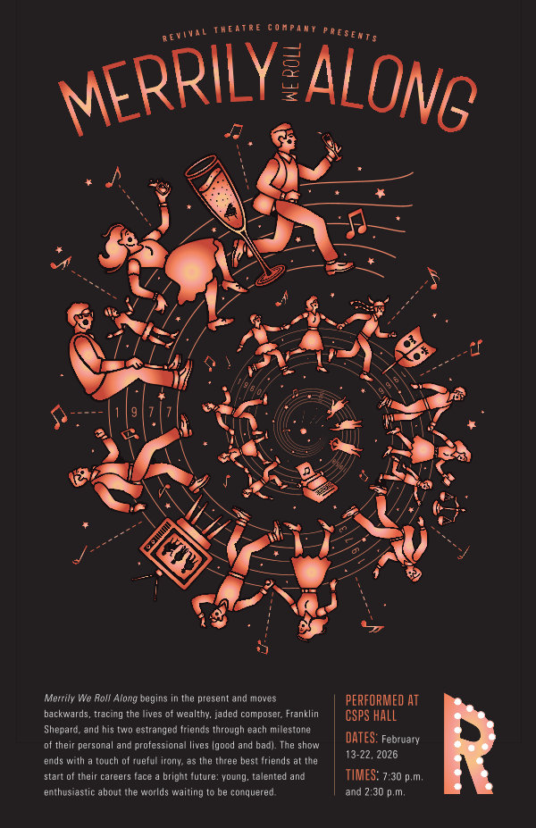 Merrily We Roll Along begins in the present and moves backwards, tracing the lives of wealthy, jaded composer, Franklin Shepard, and his two estranged friends through each milestone of their personal and professional lives( good and bad). The show ends with a touch of rueful irony, as the three best friends at the start of their careers face a bright future: young, talented and enthusiastic about the worlds waiting to be conquered.