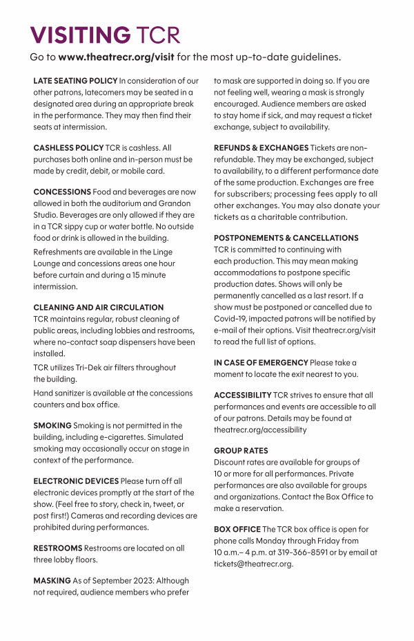 ACCESSIBILITY TCR strives to ensure that all performances and events are accessible to all of our patrons. Details may be found at theatrecr. org / accessibility