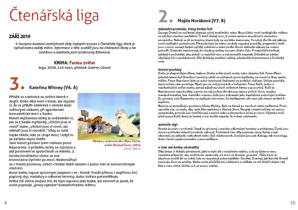 V časopise budeme uveřejňovat vždy nejlepší recenze z Čtenářské ligy, která je vyhlašována každý měsíc. Informace o této soutěži jsou na stránkách školy u na nástěnce u kabinetu paní profesorky Erbenové.