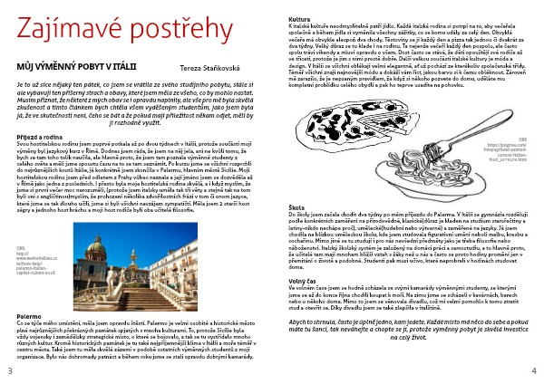 Do školy jsem začala chodit dva týdny po mém příjezdu do Palerma. V Itálii se gymnázia rozdělují podle konkrétních zaměření na přírodovědné, klasické(důraz je kladen na studium starořečtiny a latiny-nikdo nechápe proč), umělecké(hudební nebo výtvarné) a zaměřené na jazyky. Já jsem chodila na blízkou uměleckou školu, kde jsem studovala figurativní umění neboli malbu, kresbu a sochařinu. Mimo jiné se tu studují i pro nás nevšední předměty jako je třeba filosofie nebo náboženství. Italský školský systém je založený na domácí práci a samostudiu, a to hlavně proto, že učitelé tam mají mnohem bližší vztah s žáky než u nás a často se proto hodiny promění jen v přemítání o životě a podobné. Studenti pak musí učivo, které neprobrali v hodinách studovat doma.