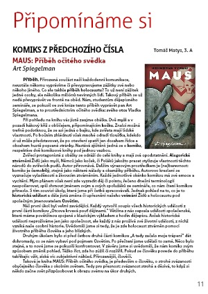 Příběh. Přirozená součást naší každodenní komunikace, neustále někomu vyprávíme či převypravujeme zážitky své nebo někoho jiného. Co ale takhle příběh holocaustu? To už není zážitek jedné osoby, ale několika miliónů nevinných lidí. Takový příběh se už nedá převyprávět ve frontě na oběd. Nám, studentům dějepisného semináře, se pokusil ve své knize tento příběh vyprávět pan Art Spiegelman, a to prostřednictvím očitého svědka: svého otce Vladka Spiegelmana.