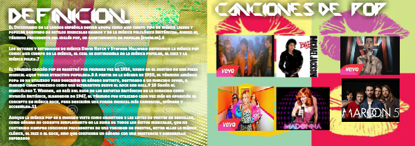 El Diccionario de la lengua española define «pop» como «un cierto tipo de música ligera y popular derivado de estilos musicales negros y de la música folclórica británica», siendo el término procedente del inglés pop, un acortamiento de popular (popular).6