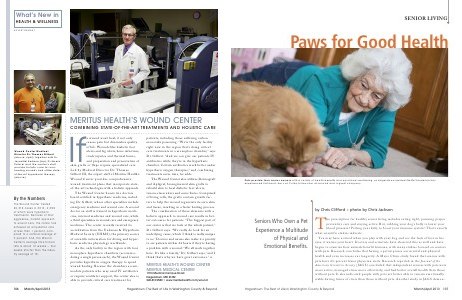 causes pain but diminishes quality of life. Wounds like diabetic foot ulcers and leg ulcers, bone infections, crush injuries and thermal burns, and preparation and preservation of skin grafts or flaps require specialized care. Led by Medical Director Dr. Thomas Gilbert III, the expert staff of Meritus Health’ s Wound Center provides comprehensive wound treatment plans that incorporate stateof-the-art technologies with a holistic approach. The Wound Center boasts two doctors board certified in hyperbaric medicine, including Dr. Gilbert, whose other specialties include emergency medicine and wound care. A second doctor on staff is trained in hyperbaric medicine, internal medicine and wound care, while a third specializes in wound care and emergency medicine. The center recently received its accreditation from the Undersea & Hyperbaric Medical Society( UHMS), the primary source of scientific information for diving and hyperbaric medicine physiology worldwide.