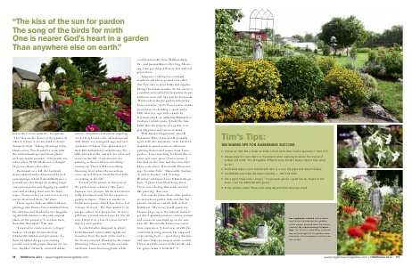 Tim says he learns from other gardeners in his local garden club, and that his passion started as a small child in East Baltimore.“ My mom would spank me because I’ d go up to the railroad tracks to get dirt. I planted potatoes, carrots, turnips and onions in cans lined up on the window sill.” But mostly, his success comes from experience.“ I don’ t ever sit still. I’ m constantly moving around. I’ m supposed to be cutting back— good thing this limited space helps me keep it under control. This is my little corner of the world, and I’ m gonna make it beautiful.” §
