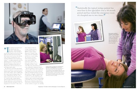 Lisa leads a patient through several simple tests to help determine on which side a patient’ s vertigo is arising. Physical therapy, exercise and other treatments help desensitize patients to vertigo symptoms and restore normal function.
