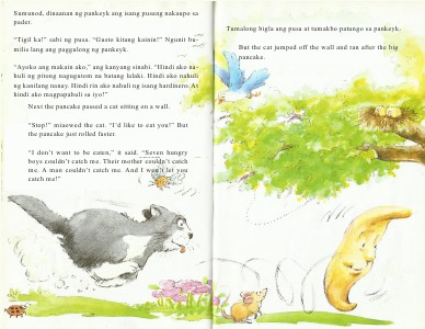 Tumalong bigla ang pusa at tumakbo patungo sa pankeyk. But the cat jumped off the wall and ran after the big pancake.