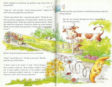 Itinulak ng baka ang eskrima at tumakbong patungo ang malaking pankeyk. But the cow pushed through the fence and galloped after the big pancake.