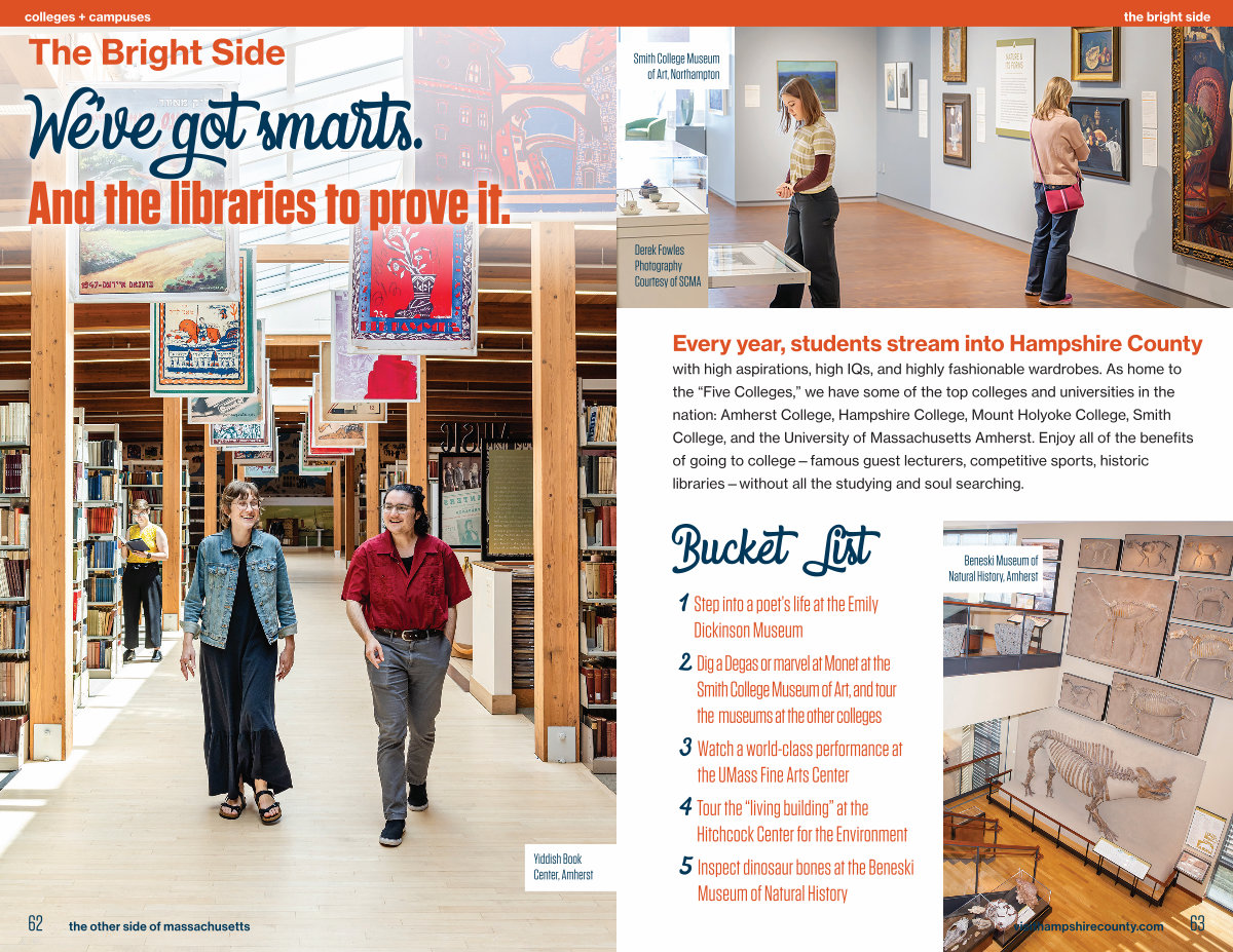 with high aspirations, high IQs, and highly fashionable wardrobes. As home to the“ Five Colleges,” we have some of the top colleges and universities in the nation: Amherst College, Hampshire College, Mount Holyoke College, Smith College, and the University of Massachusetts Amherst. Enjoy all of the benefits of going to college— famous guest lecturers, competitive sports, historic libraries— without all the studying and soul searching.