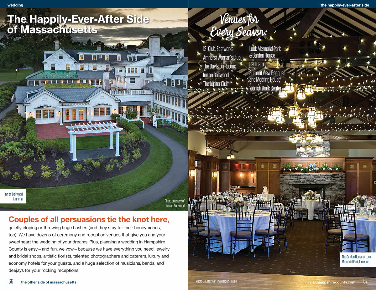 Couples of all persuasions tie the knot here, quietly eloping or throwing huge bashes( and they stay for their honeymoons, too). We have dozens of ceremony and reception venues that give you and your sweetheart the wedding of your dreams. Plus, planning a wedding in Hampshire County is easy— and fun, we vow— because we have everything you need: jewelry and bridal shops, artistic florists, talented photographers and caterers, luxury and economy hotels for your guests, and a huge selection of musicians, bands, and deejays for your rocking receptions.