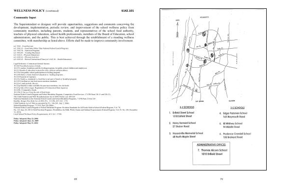 Legal Reference : Connecticut General Statutes 10-16b Prescribed courses of study . 10-215 Lunches , breakfasts and the feeding programs for public school children and employees . 10-221 Boards of education to prescribe rules , policies and procedures . 10-215a Non-public school participation in feeding program . 10-215b Duties of state board of education re : feeding programs . , 10-216 Payment of expenses . 10-215e Nutrition standards for food that is not part of lunch or breakfast program . 10-215f Certification that food meets nutrition standards . 10-221o Lunch periods . Recess . 10-221p Boards to make available for purchase nutritious , low-fat foods . 10-221q Sale of beverages . Regulations of Connecticut State Agencies 10-215b-1 Competitive foods . 10-215b-23 Income from the sale of food items . National School Lunch Program and School Breakfast Program ; Competitive Food Services . ( 7 CFR Parts 210.11 and 220.12 ) The Child Nutrition and WIC Reauthorization Act of 2004 , Public Law 108-265 Nutrition Standards in the National School Lunch and School Breakfast Programs , 7 CFR Parts 210 & 220 Healthy , Hunger-Free Kids Act of 2010 , P . L . 111-296 , 42 U . S . C . 1751 Child Nutrition Act of 1966 ( as amended by P . L . 108-269 , July 2 , 2004 ) School Breakfast Program , 7 C . F . R . Part 220 ( 2006 ) National School Lunch Program or School Breakfast Program : Nutrition Standards for All Foods Sold in School ( Federal Register , Vol . 78 , No . 125 , June 28 , 2013 ) Child Nutrition Programs : Flexibilities for Milk , Whole Grains and Sodium Requirements ( Federal Register , Vol . 83 , No . 238 , December 12 , 2018 ) Local School Wellness Policy Requirements , 42 U . S . C . 1758b