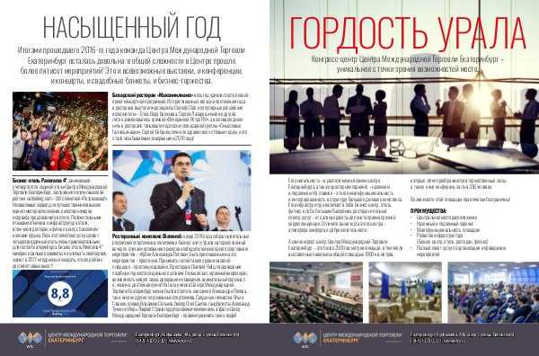 Итогами прошедшего 2016-го года команда Центра Международной Торговли Екатеринбург осталась довольна: в общей сложности в Центре прошло более пятисот мероприятий! Это и всевозможные выставки, и конференции, и концерты, и свадебные банкеты, и бизнес-торжества.
