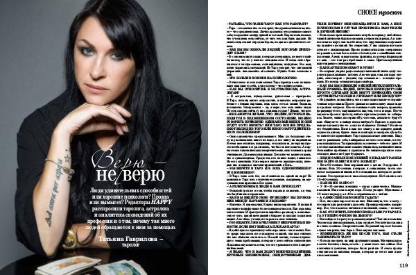 ТЕЛИ. ПОЧЕМУ ОНИ ОБРАЩАЮТСЯ К ВАМ, А НЕ К ПСИХОЛОГАМ В СЛУЧАЕ ПРОБЛЕМ НА РАБОТЕ ИЛИ В ЛИЧНОЙ ЖИЗНИ? – Если посмотреть внимательно вглубь истории, у любой значимой личности были свои маги, астрологи, жрецы. А к психологам не идут, так как боятся, что окружающие подумают: ты какой-то не такой. Это стереотип. У нас психологов часто путают с психиатрами. Просто психология пока совершенно не развита, и тем более плохо обстоят дела с семейными психологами. А ведь самая частая причина, по которой приходят ко мне, – это как раз проблемы в семье. Причем мужчины идут наравне с женщинами. – КАК КАРТЫ ПОМОГАЮТ В ЭТОМ? – Во-первых, карты редко находят виновной лишь одну сторону и рассказывают, почему. А во-вторых, там, где надо уходить, они говорят – уходить, где оставаться – советуют прощать. Но всегда оставляют право выбора. – КАК БЫ ВЫ ОЦЕНИЛИ ОБЩИЙ ИНТЕЛЛЕКТУАЛЬ НЫЙ УРОВЕНЬ ЛЮДЕЙ, КОТОРЫЕ ПРИХОДЯТ? ОНИ ПРОСТО СЛУШАЮТ ИЛИ МОГУТ ПРИВОДИТЬ СВОИ АРГУМЕНТЫ? БОЛЬШЕ СЛУШАЮТ ИЛИ БЕСЕДУЮТ? – Не думайте, пожалуйста, что ко мне ходят какие-то ограниченные персонажи. Просто разные по интеллекту люди задают разные вопросы. Кто-то понимает суть вопроса, грамотно формулирует его, задумывается над тем, что я говорю. Кто-то задает вопросы в пустоту, ничего при этом делать не собираясь. Знаете, такие, из серии « Ну, чего там, деньги-то будут?» или « Замуж-то я выйду когда-нибудь?». Бывает, я предсказываю человеку что-то, а оно не сбывается. Почему? Все из-за его бездействия. Если я вам все скажу, а вы придете домой, сядете на диван, будете жевать попкорн и смотреть « Дом-2 », то ничего не произойдет. Таро предполагают действие. Надо как-то развивать себя, выбираться из того состояния, в котором находишься. Ты приходишь за советом – тебе его дают. И вот еще важный момент: хватит обижаться, начинайте жить. Оставляйте проблемы в прошлом. Не тяните прошлое в настоящее, иначе не будет будущего. – ЛЮДИ РАЗНЫХ ПОКОЛЕНИЙ ОБЛАДАЮТ РАЗНЫ МИ ЗАПРОСАМИ? И КОГО БОЛЬШЕ? – Есть 60-летние. Они спрашивают о детях. О здоровье. О внуках. Есть 20-летние, которые, к сожалению, часто охотятся за красивой жизнью без оглядки на методы ее достижения. Это прежде всего касается девушек. Но больше всего 30 – 40-летних. – КАКОВ ИХ ЗАПРОС? – У 30 – 35-летних женщин – страх одиночества. Маниакальный. Им всем замуж пора. Поезд уходит. Мужчины в 30 хотят карьеру, а к 40 все спрашивают о любви. – А САМИ СЕБЕ ВЫ МОЖЕТЕ ГАДАТЬ? – Нет, ни один таролог не может. Максимум, что я могу, – это карту дня разложить для себя. Предупреждение, например. Все, что касается личных отношений, семьи, – не могу. – КАК ОТЛИЧИТЬ ПРОФЕССИОНАЛЬНОГО ТАРОЛО ГА ОТ НЕПРОФЕССИОНАЛЬНОГО? – Вы пойдете к врачу по рекомендациям? Так же и в магии. Человек должен понимать, куда он идет. Это штука опасная и очень сложная. Энергетически. Хороший таролог больше отдает энергии, чем берет. Поэтому их так мало. – ИЗМЕНИЛИСЬ ЛИ ВЫ ПОСЛЕ ТОГО, КАК СТАЛИ ЗАНИМАТЬСЯ ТАРО? – Я стала смотреть на мир другими глазами. Материальное, вся эта беготня, обида, злость – у меня этого нет сейчас. Нет влечения к деньгам, которое было раньше. Я стала проще относиться ко многим вещам, которые до этого мне казались важными.