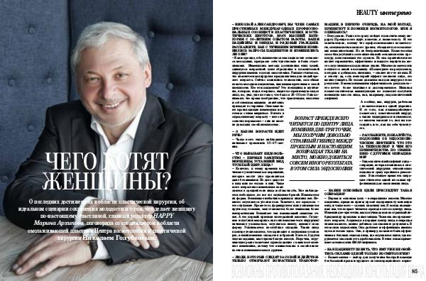 – НИКОЛАЙ АЛЕКСАНДРОВИЧ, ВЫ ЧЛЕН САМЫХ ПРЕСТИЖНЫХ МЕЖДУНАРОДНЫХ ПРОФЕССИО- НАЛЬНЫХ СООБЩЕСТВ ПЛАСТИЧЕСКИХ И ЭСТЕ- ТИЧЕСКИХ ХИРУРГОВ, ВРАЧ ВЫСШЕЙ КАТЕ- ГОРИИ С 30-ЛЕТНИМ ОПЫТОМ РАБОТЫ. ВАШИ ПАЦИЕНТЫ И ЗВЕЗДЫ, И РЯДОВЫЕ ГРАЖДАНЕ. РАССКАЖИТЕ, КАК С ТЕЧЕНИЕМ ВРЕМЕНИ ИЗМЕ- НИЛИСЬ ЗАПРОСЫ ПАЦИЕНТОВ И ИЗМЕНИЛИСЬ ЛИ ОНИ? – Как и прежде, в большинстве своем люди хотят оставаться молодыми, прекрасно себя чувствовать и быть счастливыми. Изменились методы достижения этих целей, сдвинулся возрастной ценз обращения к пластической хирургии именно в целях омоложения. Раньше считалось, что пластическая хирургия предназначена для людей зрелого возраста. Сейчас появились технологии, способные помочь молодым пациентам, имеющим претензии к своей внешности. Кто эти пациенты? Это женщины и мужчины, которые, глядя в зеркало, видят по-прежнему молодое лицо, но, увы, уже не такое, что было в 25-30 лет. Они понимают, что время необратимо, что гравитация, экология и собственная мимика неизбежно приводят к старению. Они замечают происходящие изменения и не готовы с этим мириться. В итоге к определенному возрасту – и это абсолютно нормально – они не вполне довольны своей внешностью.