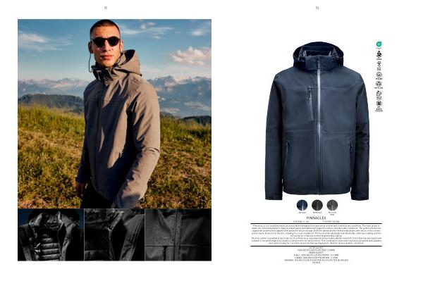 Pinnacles , a 3 in 1 multifunctional outerwear jacket designed for maximum protection and comfort in wet conditions . The outer jacket is made out of recycled polyester , features taped seams and waterproof zippers to ensure complete water resistance . The jacket includes two zipped side pockets and a zipped chest pocket for secure storage . Both the sleeves and the hem are adjustable , with velcro on the sleeves and an elastic drawcord on the hem , allowing for a customizable fit . The hood is both adjustable and detachable , offering versatility , and the chin protector enhances comfort by preventing chafing . The inner jacket is a padded jacket made out of certified recycled polyamide and provides additional warmth . It also features two zipped side pockets for secure storage and includes a chin protector for extra comfort . This combination of an outer functional rain jacket and a padded inner jacket makes for a versatile and protective layering system , ideal for various weather conditions .