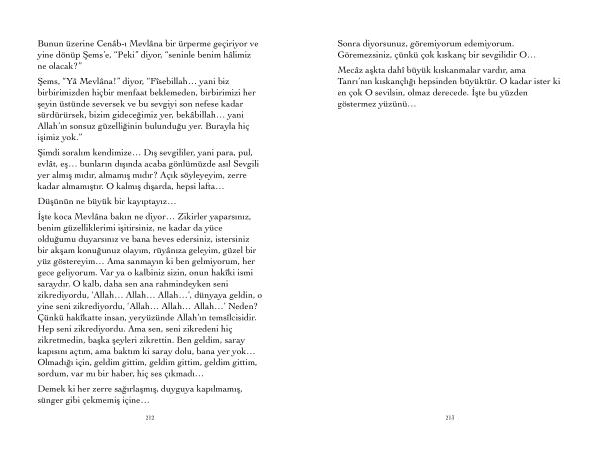 Şems , “ Yâ Mevlâna !” diyor , “ Fîsebillah … yani biz birbirimizden hiçbir menfaat beklemeden , birbirimizi her şeyin üstünde seversek ve bu sevgiyi son nefese kadar sürdürürsek , bizim gideceğimiz yer , bekâbillah … yani Allah ’ ın sonsuz güzelliğinin bulunduğu yer . Burayla hiç işimiz yok .”