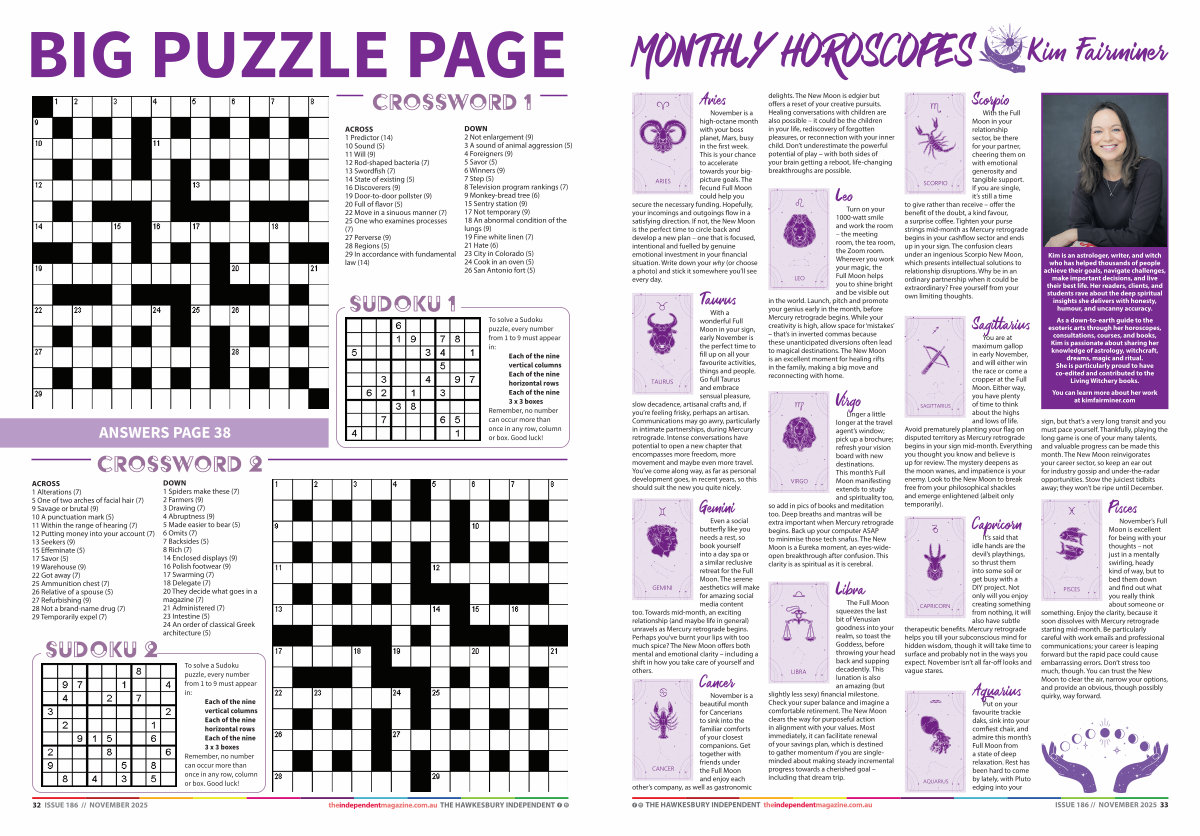 Aries November is a high-octane month with your boss planet, Mars, busy in the first week. This is your chance to accelerate towards your bigpicture goals. The fecund Full Moon could help you secure the necessary funding. Hopefully, your incomings and outgoings flow in a satisfying direction. If not, the New Moon is the perfect time to circle back and develop a new plan – one that is focused, intentional and fuelled by genuine emotional investment in your financial situation. Write down your why( or choose a photo) and stick it somewhere you’ ll see every day.