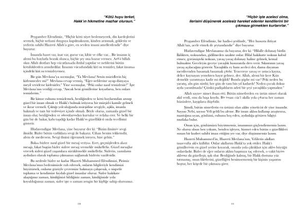 Bir gün Mevlana ’ ya sormuşlar , “ Ya Mevlana ! Senin müridlerin hiç kirlenmezler mi ?” Mevlana cevap vermiş , “ Eğer nefslerine uyup dünyaya meyil verirlerse kirlenirler .” Yine sormuşlar , “ Peki onlar nasıl temizlenir ?” İşte Mevlana ’ nın verdiği cevap , “ Ancak beni gönüllerine koyarlarsa , ben onları temizlerim .”