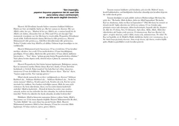 İnsanın kimliğini en açık şekilde söyleyen Hüdavendigar Mevlana ’ dır , şöyle der : “ Bu kadar Allah dediniz , daha mı Allah ’ laşmadınız ? Bu kadar Kur ’ an okudunuz , daha mı Kur ’ an ’ laşmadınız ?” Peki Mevlana bu sözüyle ne demek istedi ? Aşkla zikrettin mi , bil ki sen yoksun , O var . Çünkü aşka girmişsin oraya aşık olmuşsun , aklını kaybetmişsin , başında akıl da , düşünce de , fikir de , O olmuş . Sen , O olmuşsun . Aşk yoksa , Allah , Allah , Allah diye zikrederken akıl başka yerde gezerse , O olamıyorsun . Kur ’ an-ı Kerim ’ i de aşksız , sevgisiz okursan , sadece dilde , mana yok , anlamıyorsun . Ne oldu ? Ne Kur ’ an ’ laşabilir , ne de Hakk ’ la Hakk olabilirsin , hiçbir yere varamazsın , koca bir ömrü boşa geçirmiş olursun . Ama sevgi olursa , aşk olursa , senden kişilik gider , Hakk ’ ın güzellikleri sende kendini gösterir .