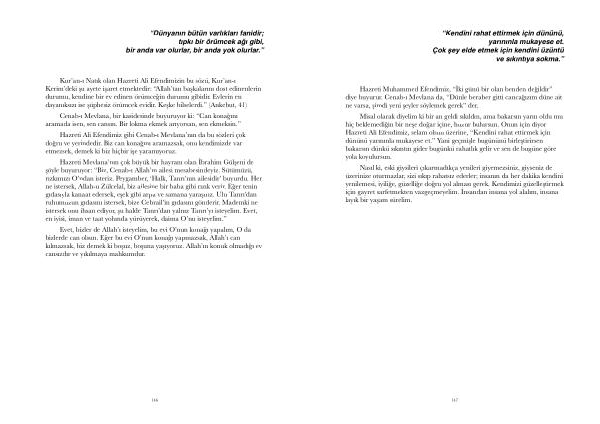 Hazreti Mevlana ’ nın çok büyük bir hayranı olan İbrahim Gülşeni de şöyle buyuruyor : “ Biz , Cenab-ı Allah ’ ın ailesi mesabesindeyiz . Sütümüzü , rızkımızı O ’ ndan isteriz . Peygamber , ‘ Halk , Tanrı ’ nın ailesidir ’ buyurdu . Her ne istersek , Allah-u Zülcelal , biz ailesine bir baba gibi rızık verir . Eğer tenin gıdasıyla kanaat edersek , eşek gibi arpa ve samana yaraşırız . Ulu Tanrı ’ dan ruhumuzun gıdasını istersek , bize Cebrail ’ in gıdasını gönderir . Mademki ne istersek onu ihsan ediyor , şu halde Tanrı ’ dan yalnız Tanrı ’ yı isteyelim . Evet , en iyisi , iman ve taat yolunda yürüyerek , daima O ’ nu isteyelim .”
