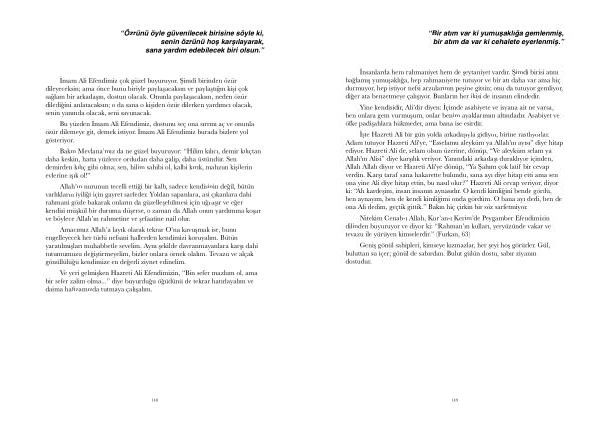 Amacımız Allah ’ a layık olarak tekrar O ’ na kavuşmak ise , bunu engelleyecek her türlü nefsani hallerden kendimizi koruyalım . Bütün yaratılmışları muhabbetle sevelim . Aynı şekilde davranmayanlara karşı dahi tutumumuzu değiştirmeyelim , bizler onlara örnek olalım . Tevazu ve alçak gönüllülüğü kendimize en değerli ziynet edinelim .