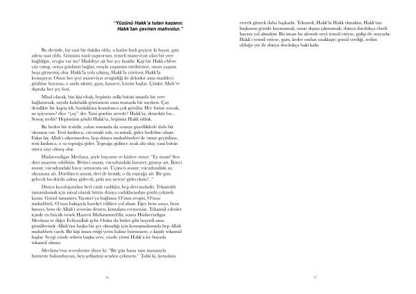ererek gitmek daha başkadır . Tekamül , Hakk ’ la Hakk olmaktır , Hakk ’ tan başkasını gönüle koymamak , onun dışına çıkmamak , dünya durdukça ebedi hayata yol almaktır . Bir insan bu alemde neyi temsil ettiyse , gidişi de orayadır . Hakk ’ ı temsil ettiyse , gam , keder ondan uzaklaşır ; gönül verdiği , teslim olduğu yer ile dünya durdukça baki kalır .