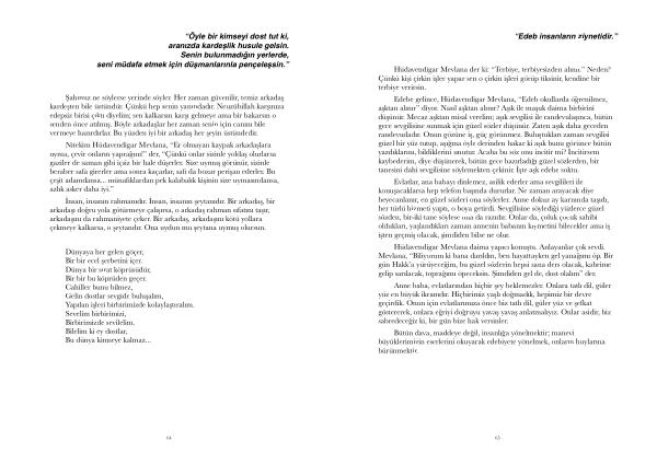 Hüdavendigar Mevlana daima yapıcı konuştu . Anlayanlar çok sevdi . Mevlana , “ Biliyorum ki bana darıldın , ben hayattayken gel yanağımı öp . Bir gün Hakk ’ a yürüyeceğim , bu güzel sözlerin hepsi sana ders olacak , kabrime gelip sarılacak , toprağımı öpeceksin . Şimdiden gel de , dost olalım ” der .