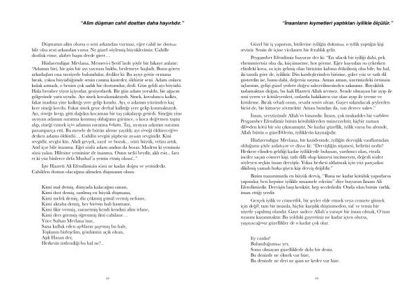 Kimi mal demiş , dünyada kalacağını sanan , Kimi dost demiş , sarılmış en büyük düşmana , Kimi melek demiş , diz çökmüş gönül vermiş nefsane , Kimi akraba demiş , her birinin hali hasmane , Kimi fikir vermiş , zannetmiş kendi kendini alim irfane , Kimi ders görmüş öğrenmiş ilmi cahilane … Yüce Sultan Mevlana ’ mız , Sana kulluk eden aşıkların şaşırmış bu hale , Toplanın birleşelim , gönlümüz açık olsun , Aşık Hasan der , Herkesin üstlendiği bu hal ne ?..