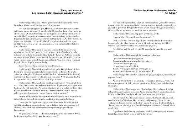 Hüdavendigar Mevlana ’ nın yatağına uzanıp da bütün gece uyku uyuduğuna dair hiçbir eserde bir belge yoktur . Çünkü Mevlana hep diz üstünde otururdu ve devamlı tefekkür halindeydi , her an Rabbine niyazda dururdu . Şems-i Tebriz Hazretlerine baktığımızda , o da bir tuğlayı kendine yastık yapmış onun üstünde başını dinlendirirdi . Yani hep ıstırap çekmişler , hiç rahatlarına düşkün olmamışlardır .