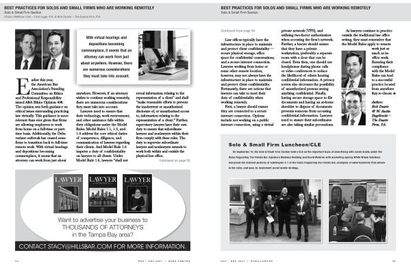 Earlier this year , the American Bar Association ’ s Standing Committee on Ethics and Professional Responsibility issued ABA Ethics Opinion 498 . The opinion sets forth guidance on ethical issues surrounding practicing law virtually . This guidance is more relevant than ever given that firms are allowing employees to work from home on a full-time or parttime basis . Additionally , the Delta variant outbreak has caused some firms to transition back to full-time remote work . With virtual hearings and depositions becoming commonplace , it seems that an attorney can work from just about