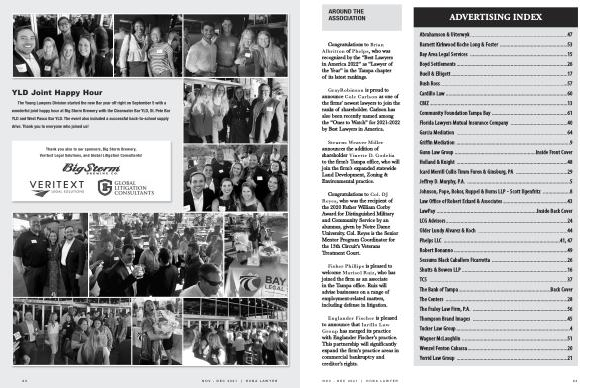 Abrahamson & Uiterwyk ........................................................................ 47 Barnett Kirkwood Koche Long & Foster .................................................. 53 Bay Area Legal Services ........................................................................ 15 Boyd Settlements .................................................................................. 26 Buell & Elligett ...................................................................................... 17 Bush Ross .............................................................................................. 57 Cardillo Law .......................................................................................... 60 CBIZ ...................................................................................................... 13 Community Foundation Tampa Bay ........................................................ 61 Florida Lawyers Mutual Insurance Company .......................................... 40 Garcia Mediation .................................................................................. 64 Griffin Mediation .................................................................................... 9 Gunn Law Group ............................................................ Inside Front Cover Holland & Knight .................................................................................. 48 Icard Merrill Cullis Timm Furen & Ginsburg , PA ...................................... 29 Jeffrey D . Murphy , P . A . ............................................................................ 5 Johnson , Pope , Bokor , Ruppel & Burns LLP - Scott Ilgenfritz .................... 8 Law Office of Robert Eckard & Associates ................................................ 43 LawPay .......................................................................... Inside Back Cover LCG Advisors .......................................................................................... 24 Older Lundy Alvarez & Koch .................................................................. 44 Phelps LLC ...................................................................................... 41 , 47 Robert Bonanno .................................................................................... 49 Sessums Black Caballero Ficarrotta ........................................................ 26 Shutts & Bowen LLP .............................................................................. 16 TCS ...................................................................................................... 37 The Bank of Tampa .................................................................... Back Cover The Centers .......................................................................................... 28 The Fraley Law Firm , P . A . ...................................................................... 56 Thompson Brand Images ...................................................................... 45 Tucker Law Group .................................................................................... 4 Wagner McLaughlin .............................................................................. 51 Wenzel Fenton Cabassa .......................................................................... 20 Yerrid Law Group .................................................................................. 21