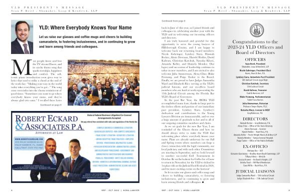 I am truly honored and grateful for this opportunity to serve the young lawyers of Hillsborough County , and I am happy to welcome back our returning board members : Nicole Gehringer , Lyndsey Siara , Hannah Becker , Alexis Deveaux , Harold Holder , David Kalteux , Christian Katchuk , Natasha Khoyi , Amanda Keller , and Daniela Mendez . Our legacy and succession of leadership continues to usher in new members , and I am excited to also welcome Julia Ammerman , Alexa Cline , Blake Fromang , and Paige Tucker to the Board . Finally , we are proud to have Judges Samantha Ward and Elizabeth Rice serving as the YLD ’ s judicial liaisons , and our ex-officio board members who are hard at work representing the 13th Judicial Circuit among the Florida Bar YLD ’ s Board of Governors .