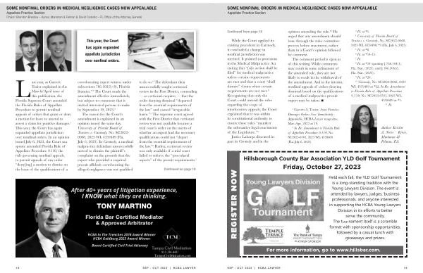 Last year , as Garrett Tozier explained in the March / April issue of this publication , the Florida Supreme Court amended the Florida Rules of Appellate Procedure to permit nonfinal appeals of orders that grant or deny a motion for leave to amend to assert a claim for punitive damages . 1 This year , the Court has again expanded appellate jurisdiction over nonfinal orders . In an opinion issued July 6 , 2023 , the Court sua sponte amended Florida Rule of Appellate Procedure 9.130 , the rule governing nonfinal appeals , to permit appeals of any order “ deny [ ing ] a motion to dismiss on the basis of the qualifications of a corroborating expert witness under subsections 766.102 ( 5 ) - ( 9 ), Florida Statutes .” 2 The Court made the amendment effective immediately , but subject to comments that it invited interested persons to make by September 19 , 2023 . 3