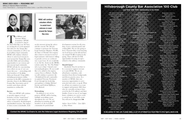 The Military and Veterans Affairs Committee ( MVAC ) is excited to ring in the 2023-2024 Bar year . We have an exciting list of events planned that will serve the Tampa Bay veteran community as well as our local military legal community . MVAC will continue volunteer efforts to assist local veterans in need around the Tampa Bay area and offer CLEs and networking opportunities to our veteran and non-veteran legal community . MVAC will also be concentrating more efforts on one of our core tenets this year — networking with local members of the Judge Advocate Generals ’ Corps ( JAG ), including government civilian attorneys in the JAG community , to introduce them to the Hillsborough County Bar Association and , if needed , assist them with the transition to civilian life .