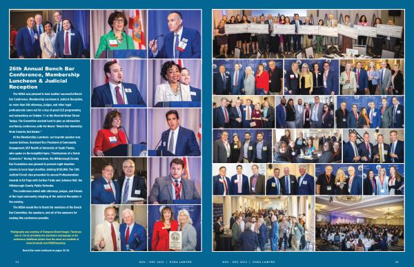 thehcBawaspleasedtohostanothersuccessfulBench Barconference , Membershipluncheon & Judicialreception , asmorethan500attorneys , judges , andotherlegal professionalscameoutforadayofgreatcleprogramming andnetworkingonoctober11attheMarriottwaterstreet tampa . thecommitteeworkedhardtoplananinformative andtimelyconference , withthetheme “ BenchBaruniversity : worksmarter , notharder .” attheMembershipluncheon , ourkeynotespeakerwas Joannesullivan , assistantvicePresidentofcommunity engagement , usfhealthatuniversityofsouthflorida , whospokeontheinsightfultopic , “ confessionsofaserial connector .” duringtheluncheon , thehillsboroughcounty Barfoundationwaspleasedtopresenteightdonation checkstolocallegalcharities , totaling $ 120,000 . the13th JudicialcircuitalsopresenteditsannualProfessionalism awardstoedPagewithcarltonfieldsandJulianneholt , the hillsboroughcountyPublicdefender . theconferenceendedwithattorneys , judges , andfriends ofthelegalcommunityminglingattheJudicialreceptionin theevening . thehcBawouldliketothankthemembersoftheBench Barcommittee , thespeakers , andallofthesponsorsfor makingthisconferencepossible .