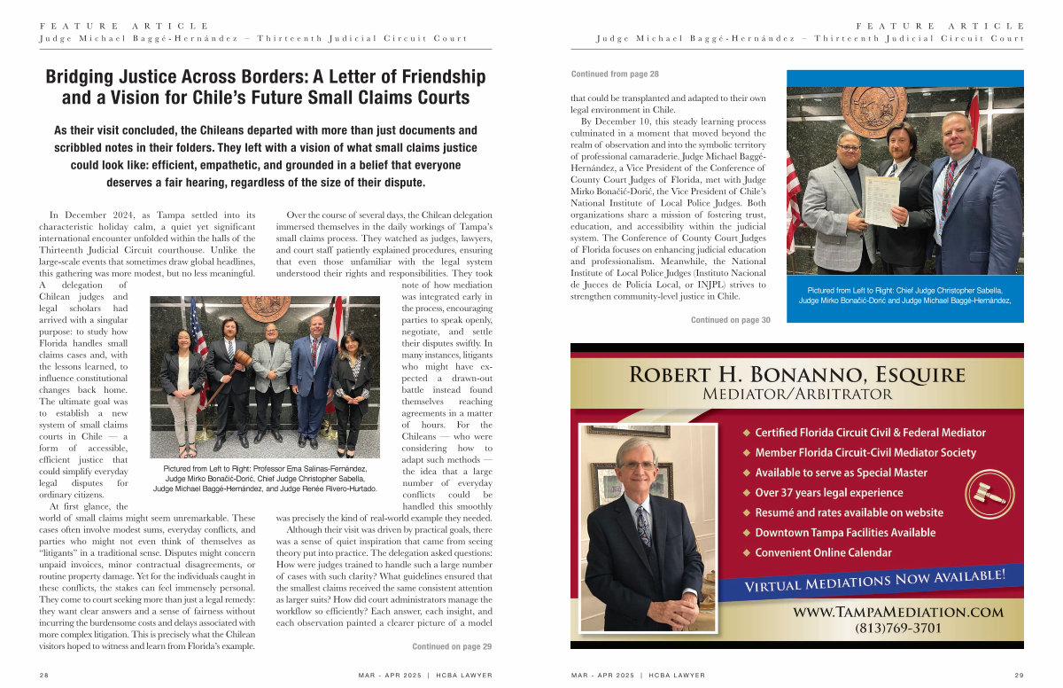 By december 10 , this steady learning process culminated in a moment that moved beyond the realm of observation and into the symbolic territory of professional camaraderie . Judge Michael Baggé- Hernández , a vice President of the Conference of County Court Judges of Florida , met with Judge Mirko Bonačić-dorić , the vice President of Chile ’ s National Institute of Local Police Judges . Both organizations share a mission of fostering trust , education , and accessibility within the judicial system . The Conference of County Court Judges of Florida focuses on enhancing judicial education and professionalism . Meanwhile , the National Institute of Local Police Judges ( Instituto Nacional de Jueces de Policía Local , or INJPL ) strives to strengthen community-level justice in Chile .