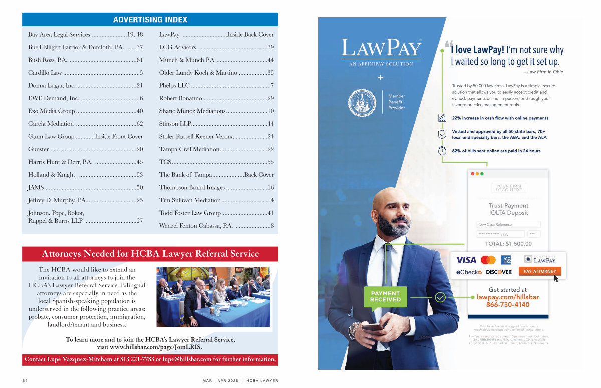 LawPay ............................ Inside Back Cover LCg Advisors ............................................ 39 Munch & Munch P . A ................................. 44 older Lundy Koch & Martino .................. 35 Phelps LLC .................................................. 7 Robert Bonanno ........................................ 29 Shane Munoz Mediations .......................... 10 Stinson LLP ................................................ 44 Stoler Russell Keener verona .................... 24 Tampa Civil Mediation .............................. 22 TCS ............................................................ 55 The Bank of Tampa .................... Back Cover Thompson Brand Images .......................... 16 Tim Sullivan Mediation .............................. 4 Todd Foster Law group ............................ 41 Wenzel Fenton Cabassa , P . A . ...................... 8