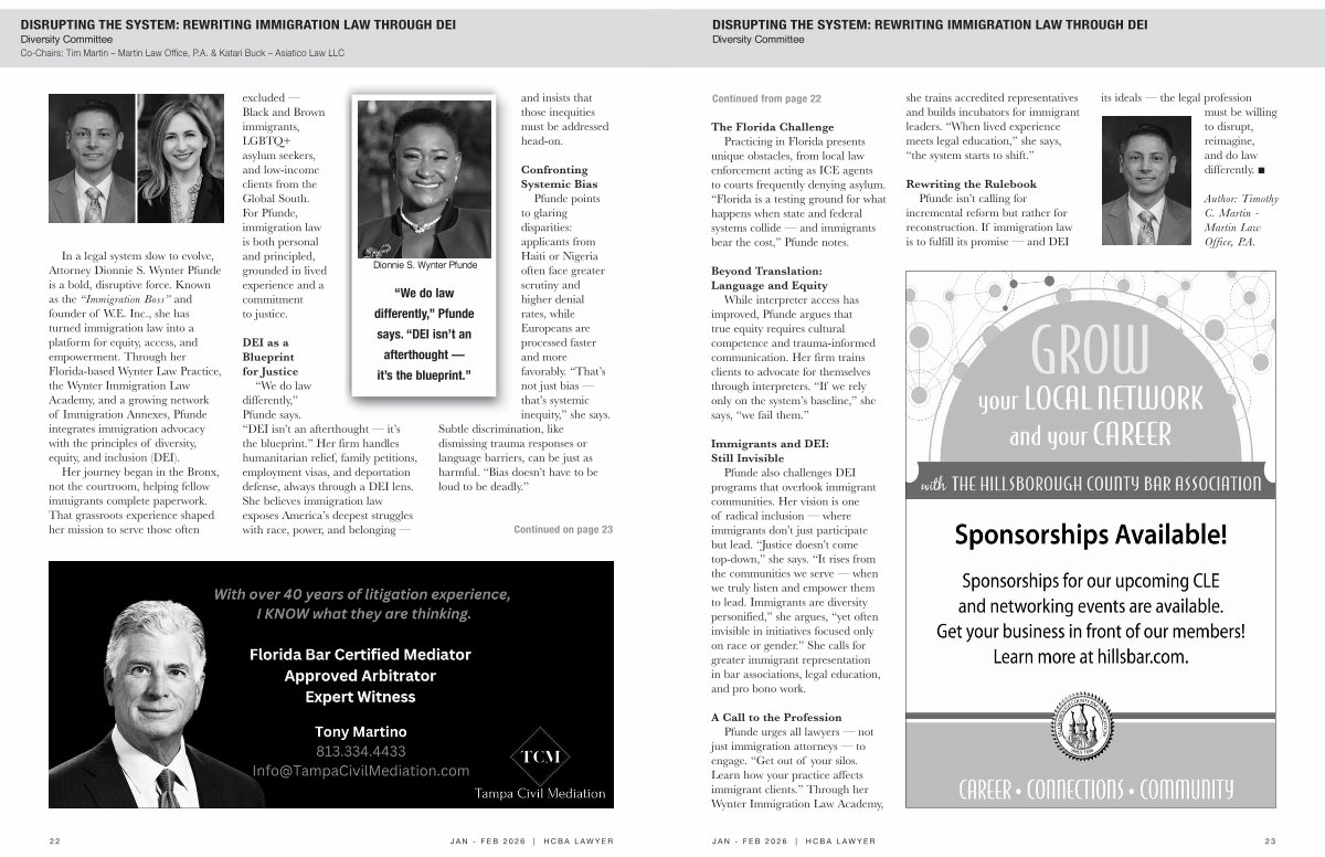 Pfunde isn’ t calling for incremental reform but rather for reconstruction. If immigration law is to fulfill its promise— and DEI its ideals— the legal profession must be willing to disrupt, reimagine, and do law differently. n