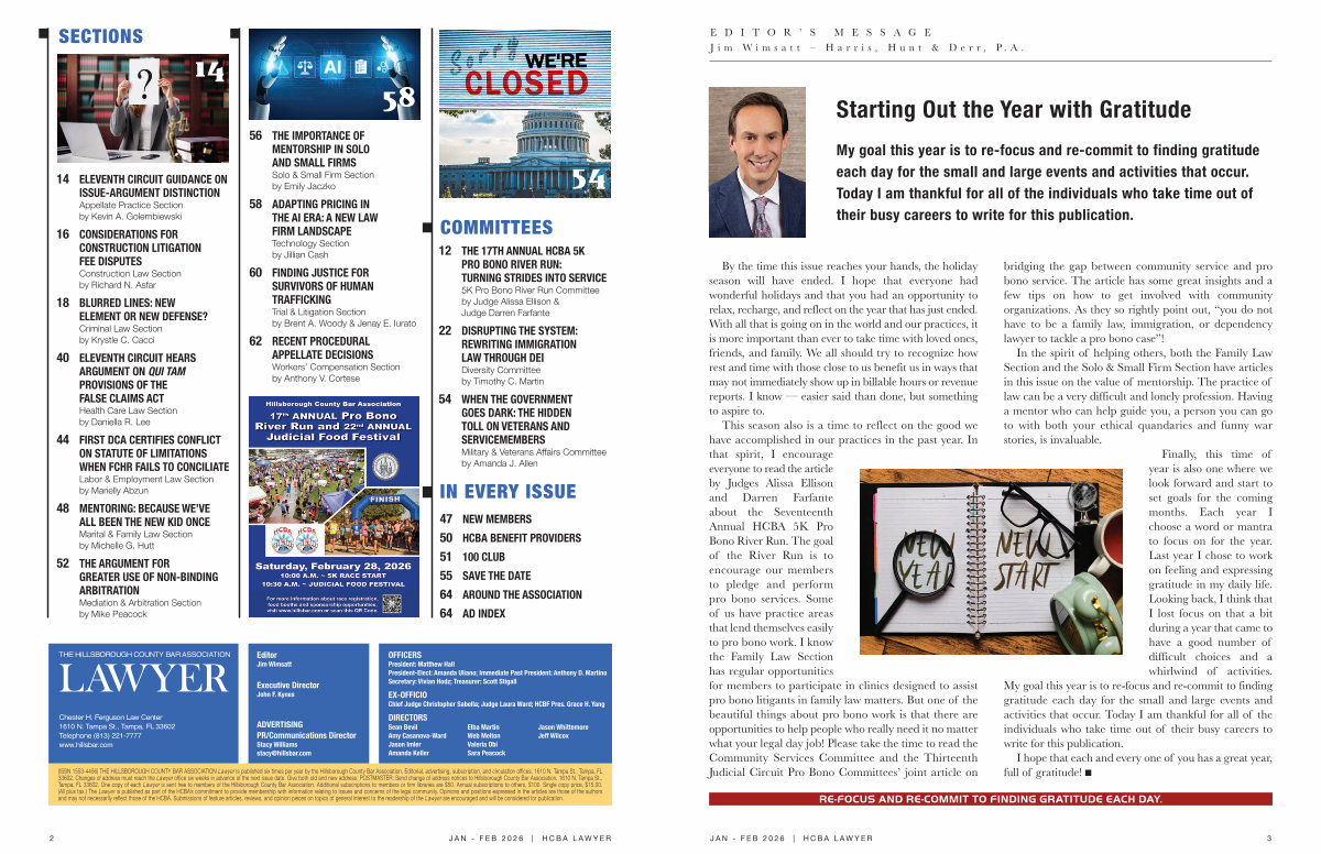 ( ISSN1553-4456) THEHILLSBOROUGHCOUNTYBARASSOCIATIONLawyer ispublishedsixtimesperyearbytheHillsboroughCountyBarAssociation. Editorial, advertising, subscription, andcirculationoffices: 1610N. TampaSt., Tampa, FL 33602. ChangesofaddressmustreachtheLawyer officesixweeksinadvanceofthenextissuedate. Givebotholdandnewaddress. POSTMASTER: SendchangeofaddressnoticestoHillsboroughCountyBarAssociation, 1610N. TampaSt., Tampa, FL33602. OnecopyofeachLawyer issentfreetomembersoftheHillsboroughCountyBarAssociation. Additionalsubscriptionstomembersorfirmlibrariesare $ 50. Annualsubscriptionstoothers, $ 100. Singlecopyprice, $ 15.00.( Allplustax.) TheLawyer ispublishedaspartoftheHCBA’ scommitmenttoprovidemembershipwithinformationrelatingtoissuesandconcernsofthelegalcommunity. Opinionsandpositionsexpressedinthearticlesarethoseoftheauthors andmaynotnecessarilyreflectthoseoftheHCBA. Submissionsoffeaturearticles, reviews, andopinionpiecesontopicsofgeneralinteresttothereadershipoftheLawyer areencouragedandwillbeconsideredforpublication.