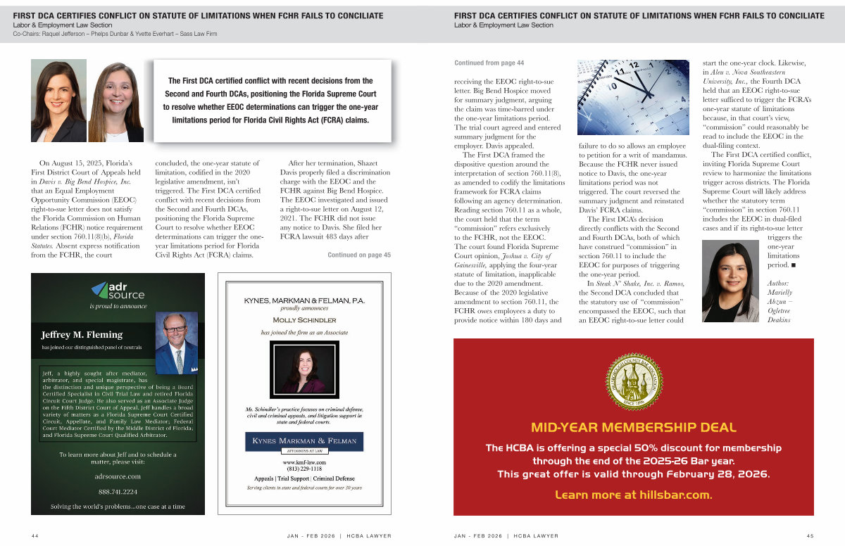 On August 15, 2025, Florida’ s First District Court of Appeals held in Davis v. Big Bend Hospice, Inc. that an Equal Employment Opportunity Commission( EEOC) right-to-sue letter does not satisfy the Florida Commission on Human Relations( FCHR) notice requirement under section 760.11( 8)( b), Florida Statutes. Absent express notification from the FCHR, the court concluded, the one-year statute of limitation, codified in the 2020 legislative amendment, isn’ t triggered. The First DCA certified conflict with recent decisions from the Second and Fourth DCAs, positioning the Florida Supreme Court to resolve whether EEOC determinations can trigger the oneyear limitations period for Florida Civil Rights Act( FCRA) claims.