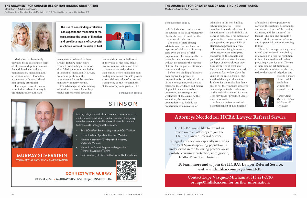 Mediation & Arbitration Section Co-Chairs: LaraTibbals – TibbalsMediation, LLC & ChristineDerr – Harris, Hunt & Derr, P. A.