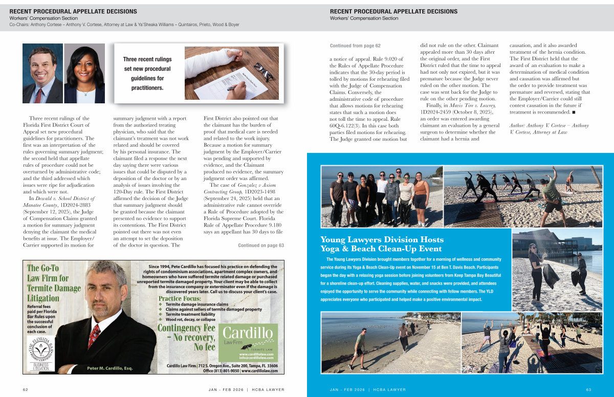 the Young lawyers division brought members together for a morning of wellness and community service during its Yoga & Beach clean-up event on november 15 at Ben t. davis Beach. participants began the day with a relaxing yoga session before joining volunteers from keep tampa Bay Beautiful for a shoreline clean-up effort. cleaning supplies, water, and snacks were provided, and attendees enjoyed the opportunity to serve the community while connecting with fellow members. the Yld appreciates everyone who participated and helped make a positive environmental impact.