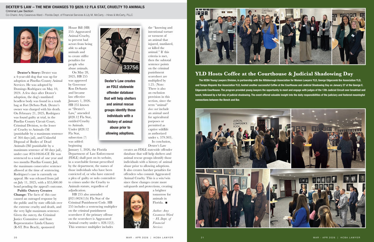On May 28, 2025, HB 255 was approved by Governor Ron DeSantis and became law effective January 1, 2026. HB 255 known as“ Dexter’ s Law,” amended § 828.12 Fla Stat, entitled Cruelty to Animals. Under § 828.12 Fla Stat, subsection( 7) was added: beginning January 1, 2026, the Florida Department of Law Enforcement( FDLE) shall post on its website, in a searchable format prescribed by the department, the names of those individuals who have been convicted of, or who have entered a plea of guilty or nolo contendere to crimes under the Cruelty to Animals statute, regardless of adjudication.