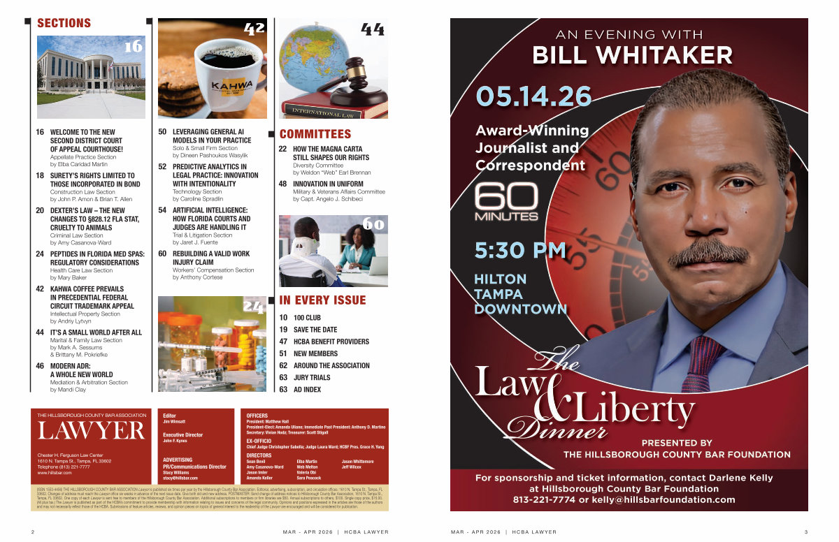 ( ISSN1553-4456) THEHILLSBOROUGHCOUNTYBARASSOCIATIONLawyer ispublishedsixtimesperyearbytheHillsboroughCountyBarAssociation. Editorial, advertising, subscription, andcirculationoffices: 1610N. TampaSt., Tampa, FL 33602. ChangesofaddressmustreachtheLawyer officesixweeksinadvanceofthenextissuedate. Givebotholdandnewaddress. POSTMASTER: SendchangeofaddressnoticestoHillsboroughCountyBarAssociation, 1610N. TampaSt., Tampa, FL33602. OnecopyofeachLawyer issentfreetomembersoftheHillsboroughCountyBarAssociation. Additionalsubscriptionstomembersorfirmlibrariesare $ 50. Annualsubscriptionstoothers, $ 100. Singlecopyprice, $ 15.00.( Allplustax.) TheLawyer ispublishedaspartoftheHCBA’ scommitmenttoprovidemembershipwithinformationrelatingtoissuesandconcernsofthelegalcommunity. Opinionsandpositionsexpressedinthearticlesarethoseoftheauthors andmaynotnecessarilyreflectthoseoftheHCBA. Submissionsoffeaturearticles, reviews, andopinionpiecesontopicsofgeneralinteresttothereadershipoftheLawyer areencouragedandwillbeconsideredforpublication.