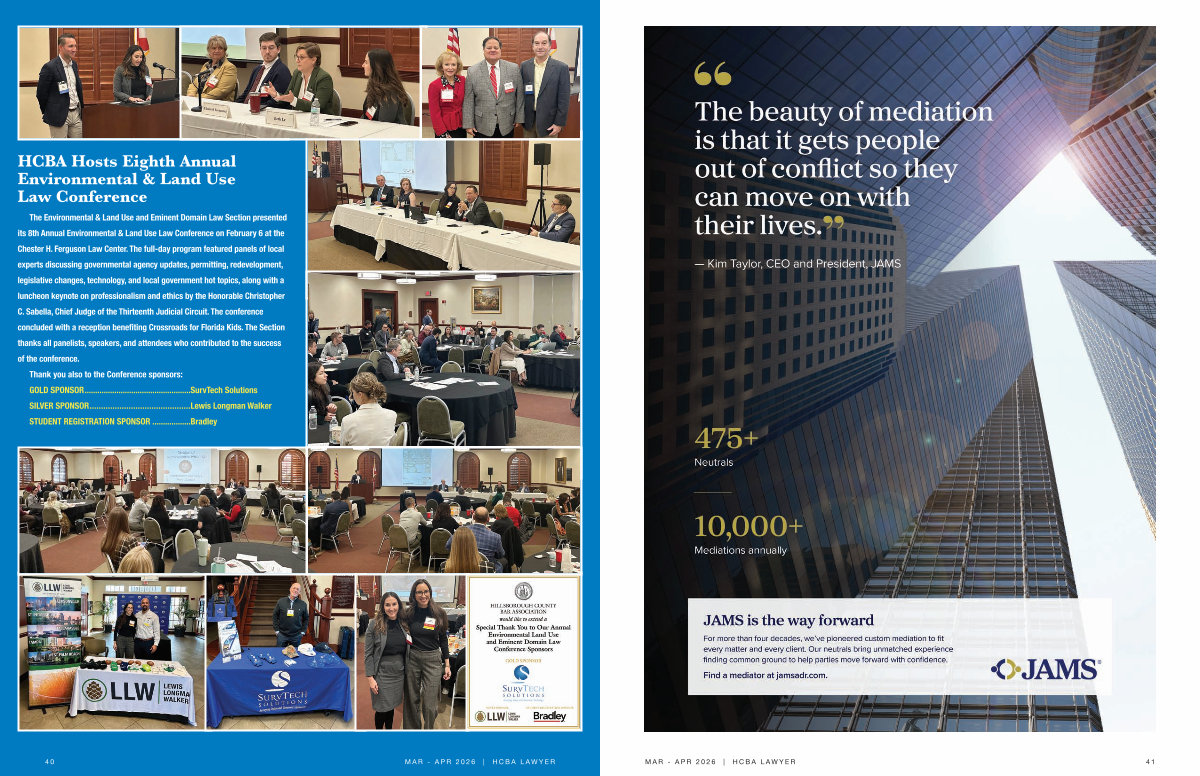 the environmental & Land use and eminent domain Law section presented its 8th annual environmental & Land use Law Conference on february 6 at the Chester h. ferguson Law Center. the full-day program featured panels of local experts discussing governmental agency updates, permitting, redevelopment, legislative changes, technology, and local government hot topics, along with a luncheon keynote on professionalism and ethics by the honorable Christopher C. sabella, Chief Judge of the thirteenth Judicial Circuit. the conference concluded with a reception benefiting Crossroads for florida kids. the section thanks all panelists, speakers, and attendees who contributed to the success of the conference. thank you also to the Conference sponsors: goLd sponsor.................................................. survtech solutions siLver sponsor............................................ Lewis Longman walker student registration sponsor.................. bradley