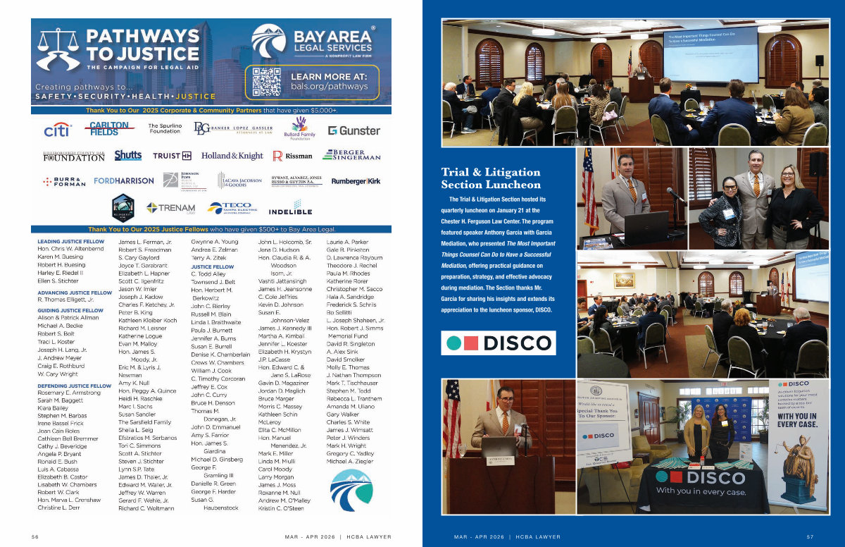 the trial & Litigation section hosted its quarterly luncheon on January 21 at the Chester h. ferguson Law Center. the program featured speaker anthony garcia with garcia Mediation, who presented the Most important things Counsel Can do to have a successful Mediation, offering practical guidance on preparation, strategy, and effective advocacy during mediation. the section thanks Mr. garcia for sharing his insights and extends its appreciation to the luncheon sponsor, disCo.