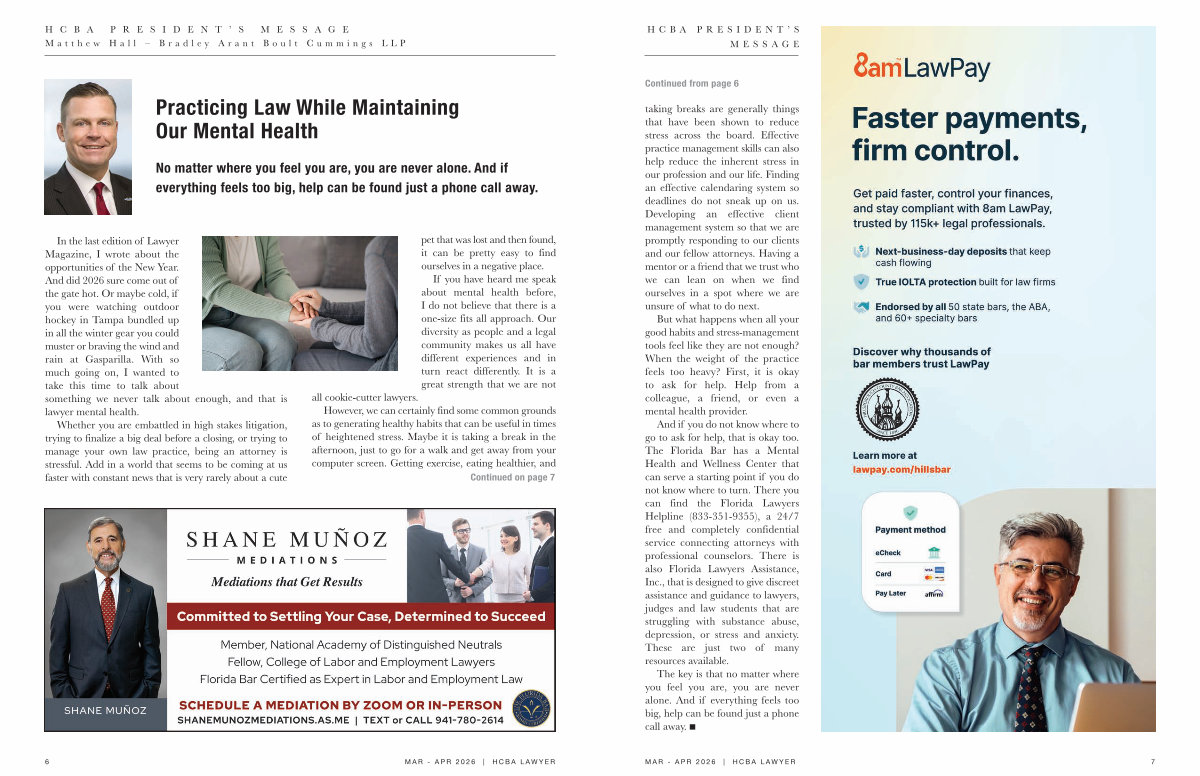 In the last edition of Lawyer Magazine, I wrote about the opportunities of the New Year. And did 2026 sure come out of the gate hot. Or maybe cold, if you were watching outdoor hockey in Tampa bundled up in all the winter gear you could muster or braving the wind and rain at Gasparilla. With so much going on, I wanted to take this time to talk about something we never talk about enough, and that is lawyer mental health.