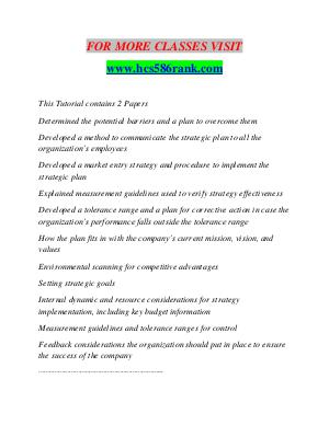 FOR MORE CLASSES VISIT www.hcs586rank.com This Tutorial contains 2 Papers Determined the potential barriers and a plan to overcome them Developed a method to communicate the strategic plan to all the organization’s employees Developed a market entry strategy and procedure to implement the strategic plan Explained measurement guidelines used to verify strategy effectiveness Developed a tolerance range and a plan for corrective action in case the organization’s performance falls outside the tolerance range How the plan fits in with the company’s current mission, vision, and values Environmental scanning for competitive advantages Setting strategic goals Internal dynamic and resource considerations for strategy implementation, including key budget information Measurement guidelines and tolerance ranges for control Feedback considerations the organization should put in place to ensure the success of the company ---------------------------------------------------------------------