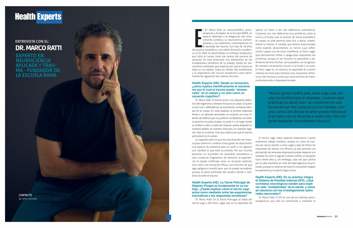 El Dr. Marco Ratti es neurocientífico, psicoterapeuta y fundador de la Escuela RAMA, un espacio dedicado a la integración del conocimiento somático, la neurociencia contemporánea y las tradiciones contemplativas en el abordaje del trauma. Con más de 18 años de práctica monástica y una sólida formación académica, el Dr. Ratti ha desarrollado un enfoque terapéutico que sitúa al cuerpo como eje central del proceso de sanación. En esta entrevista, nos adentramos en los fundamentos científicos de su trabajo: desde los mecanismos cerebrales que explican por qué el trauma se aloja en los tejidos, hasta los límites del mindfulness y la importancia del vínculo terapéutico como herramienta de regulación del sistema nervioso.