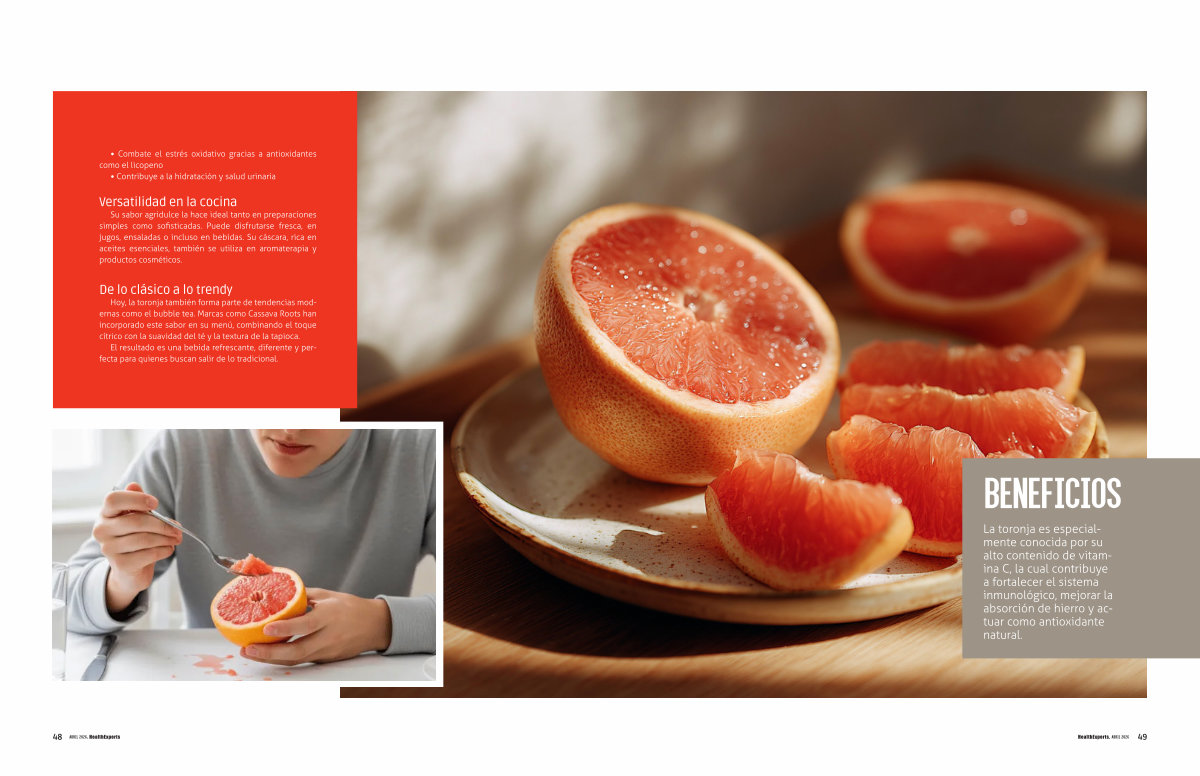 La toronja es especialmente conocida por su alto contenido de vitamina C, la cual contribuye a fortalecer el sistema inmunológico, mejorar la absorción de hierro y actuar como antioxidante natural.